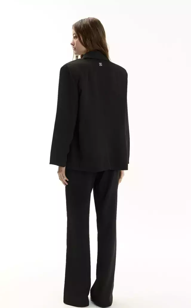 Blazer corte oversize con hombros caídos y leve entalle en cintura. Cierre frontal con cruce simple y un broche metálico. Prenda con hombreras, forrada totalmente en su interior. Lleva 2 bolsillos falsos tipo ojal con solapa en su frente.