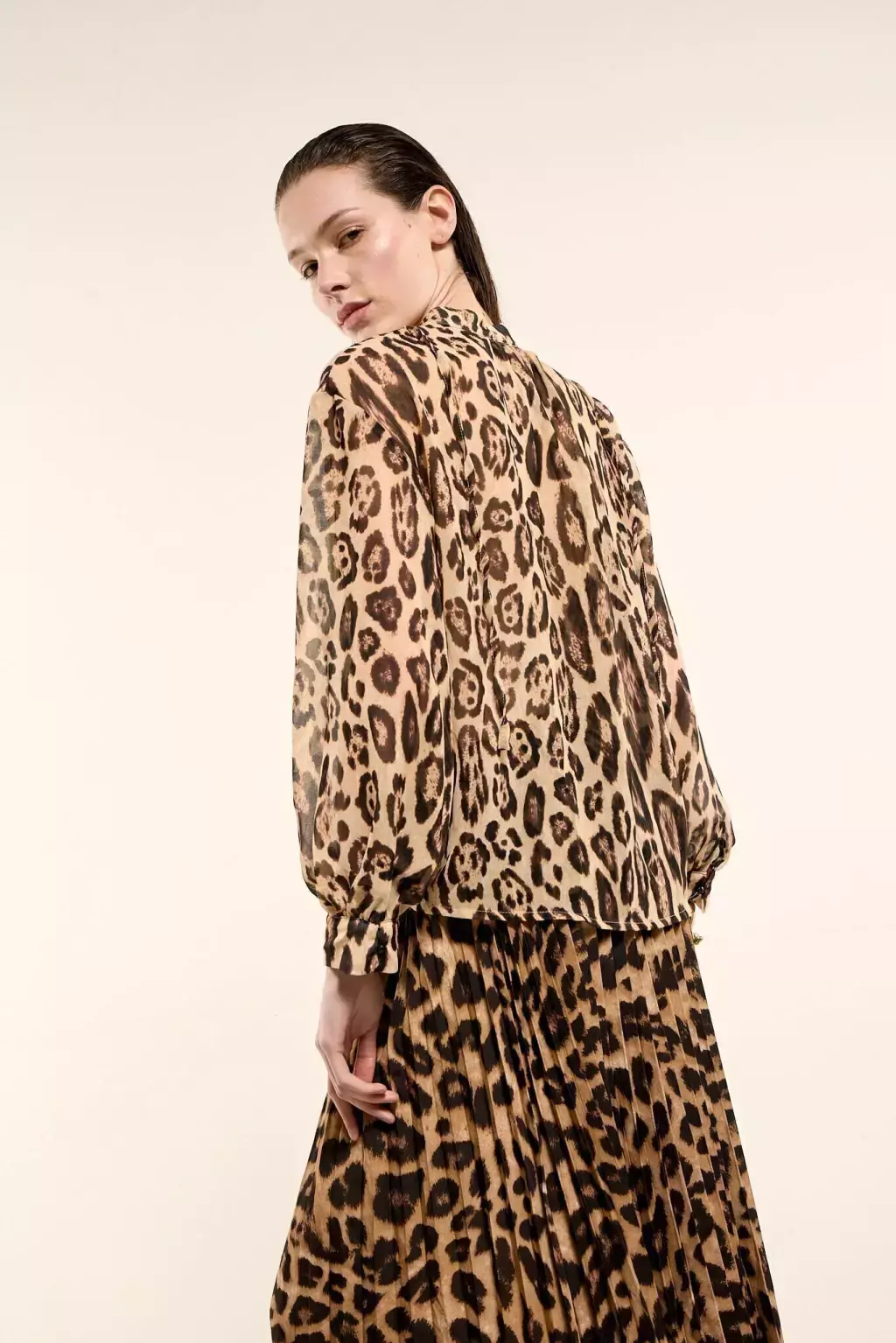 Blusa de manga larga con estampado animal Print en tonos marrones y negros, de caída suave y fluida que aporta movimiento. Presenta un escote en “V” pronunciado con tiras finas que rodean el cuello, aportando un detalle distintivo. Su silueta holgada ofrece un aire relajado y elegante, complementado por el movimiento natural de la tela.