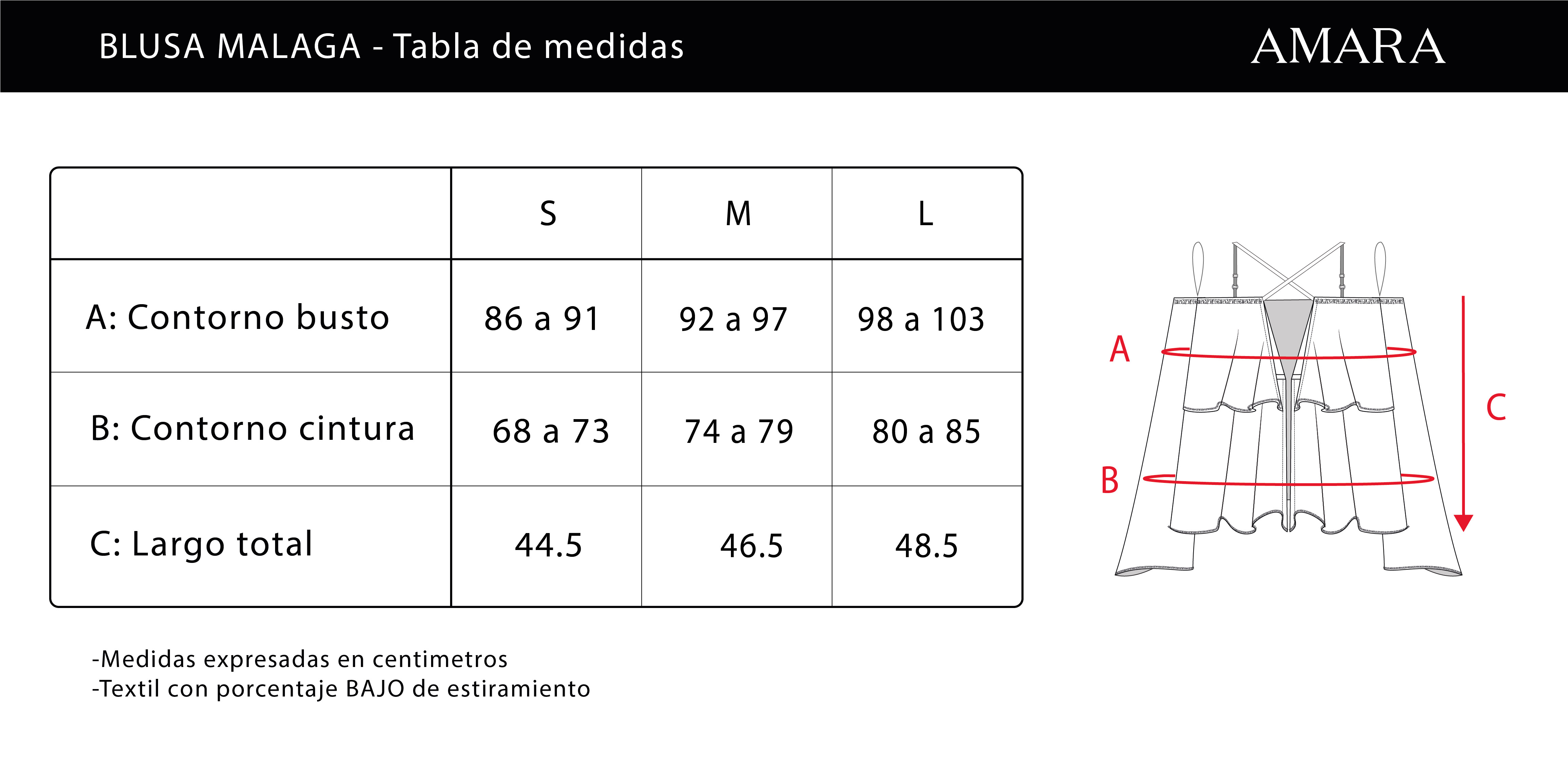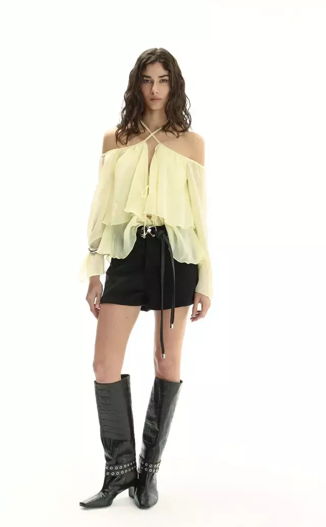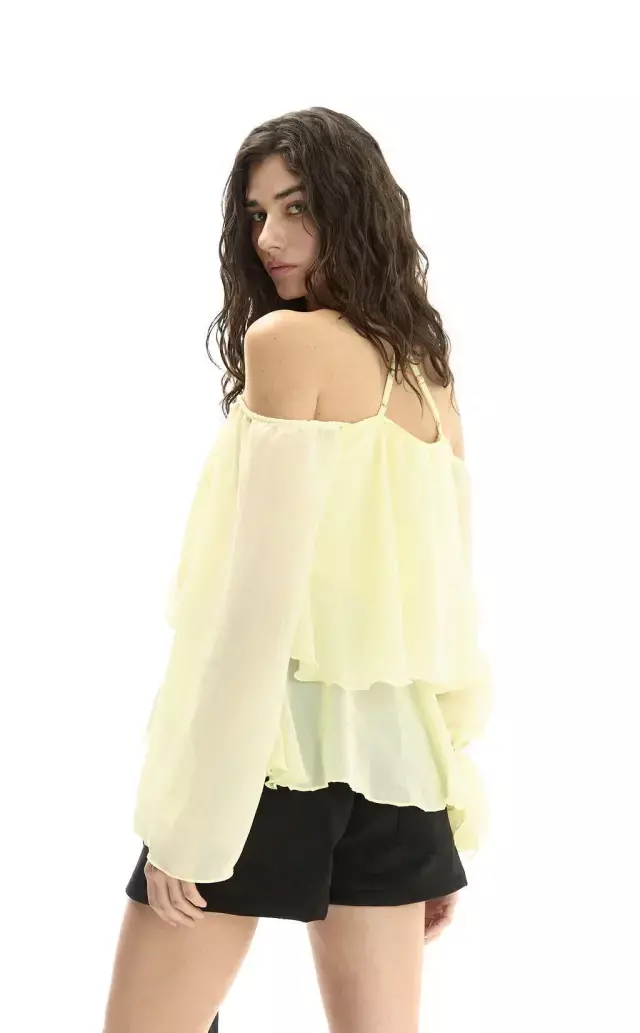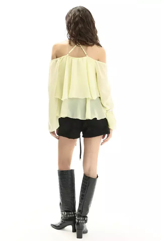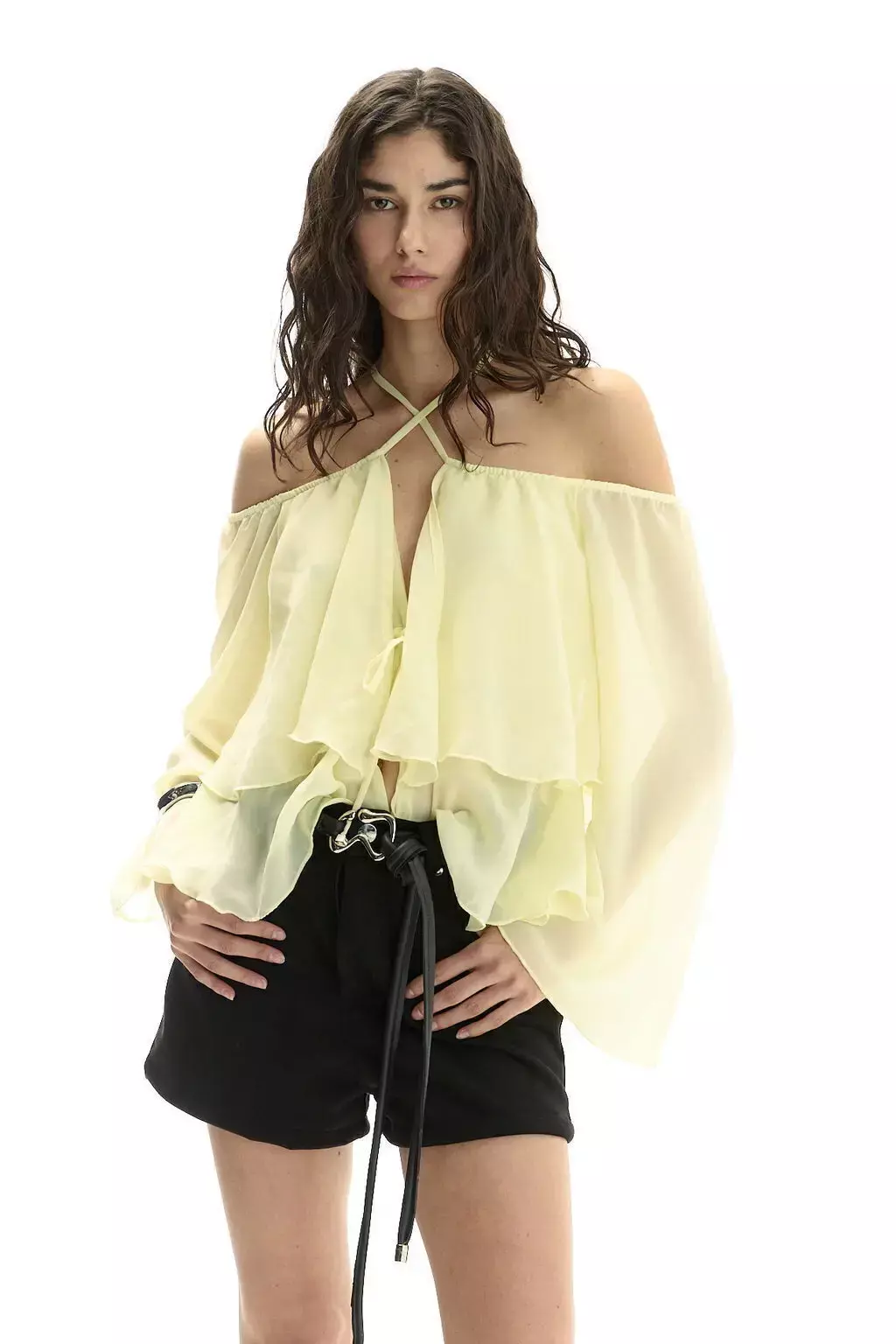Blusa holgada manga larga, que deja los hombros al descubierto y genera un entrecruzado de breteles finos. Lleva frunces decorativos a lo largo de toda la prenda. Se anuda en el centro del busto. La zona del corpiño está completamente forrada.