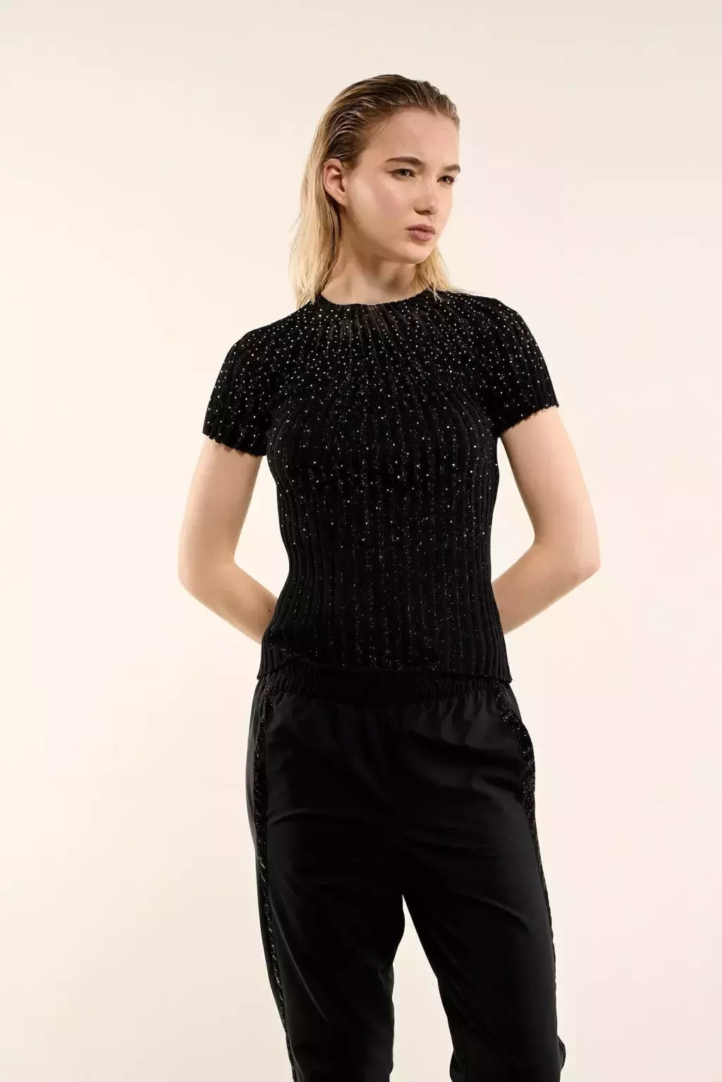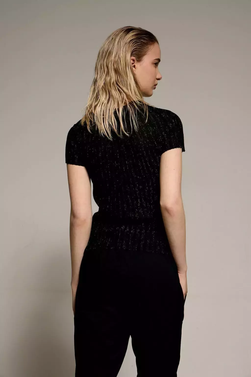 Top negro de manga corta con textura acanalada y delicados destellos que aportan un brillo sutil. Su ajuste ceñido realza la figura, mientras que el diseño elástico y ligero brinda comodidad y un estilo sofisticado con un toque moderno.