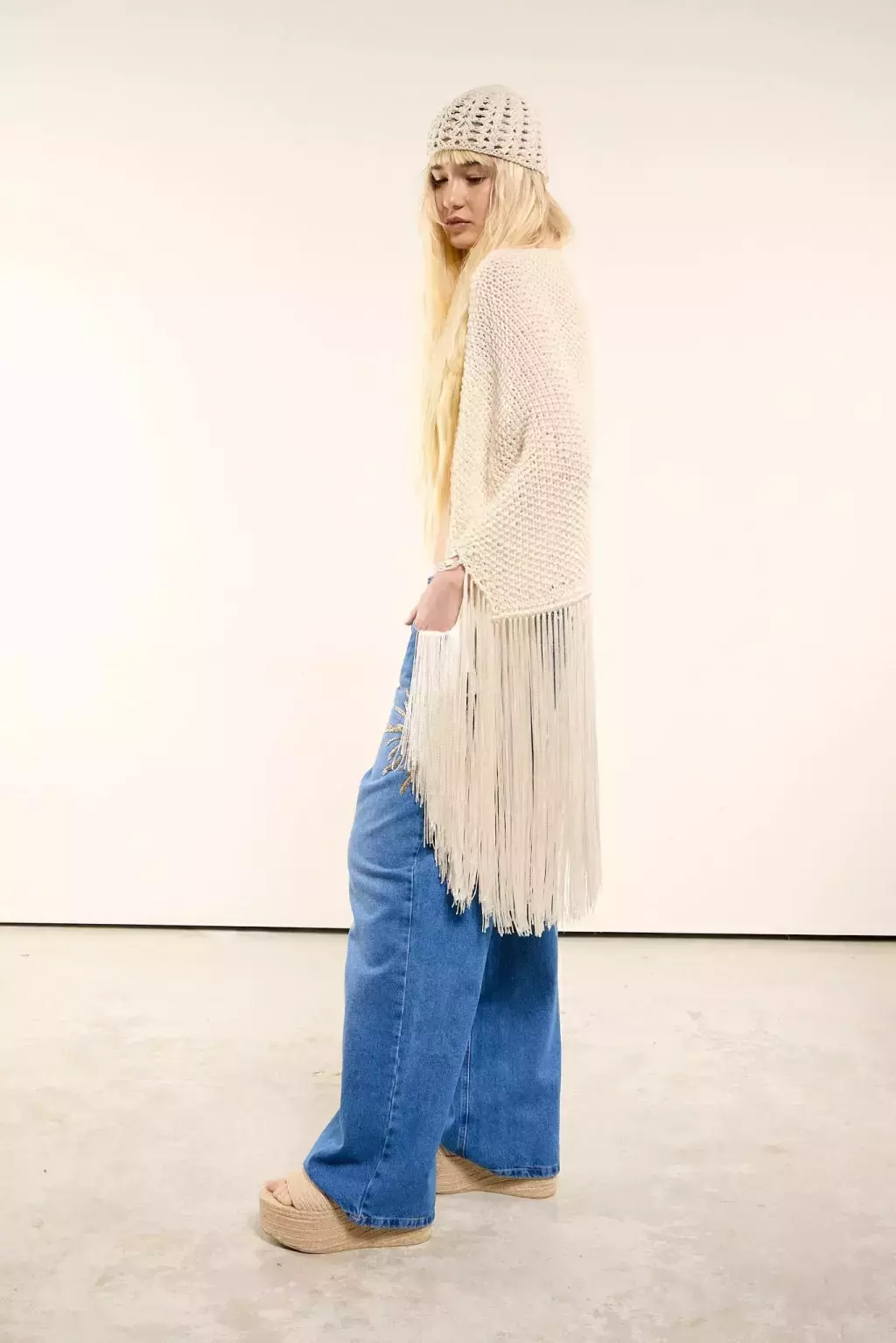 Poncho abierto de tejido calado con terminaciones en flecos largos que aportan movimiento y un aire bohemio. Su diseño suelto y ligero lo convierte en una prenda versátil para superponer sobre distintos estilos.