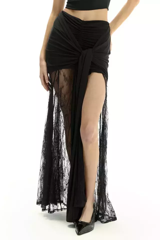 Falda larga con la zona superior ceñida al cuerpo y la parte inferior voluminosa. Arriba genera frunces y lleva dos pañuelos anudables en el centro. Está totalmente forrado. Por debajo lleva una varios recortes y quillas que le dan soltura y movimiento a la prenda.