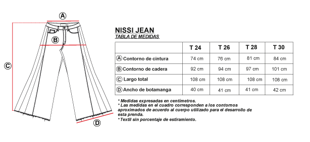 Pantalón denim corte wide leg y tiro medio, con cinco bolsillos, cierre frontal con cremallera y botón metálico. Presenta recortes laterales y lavado artesanal, por lo que el tono puede variar.