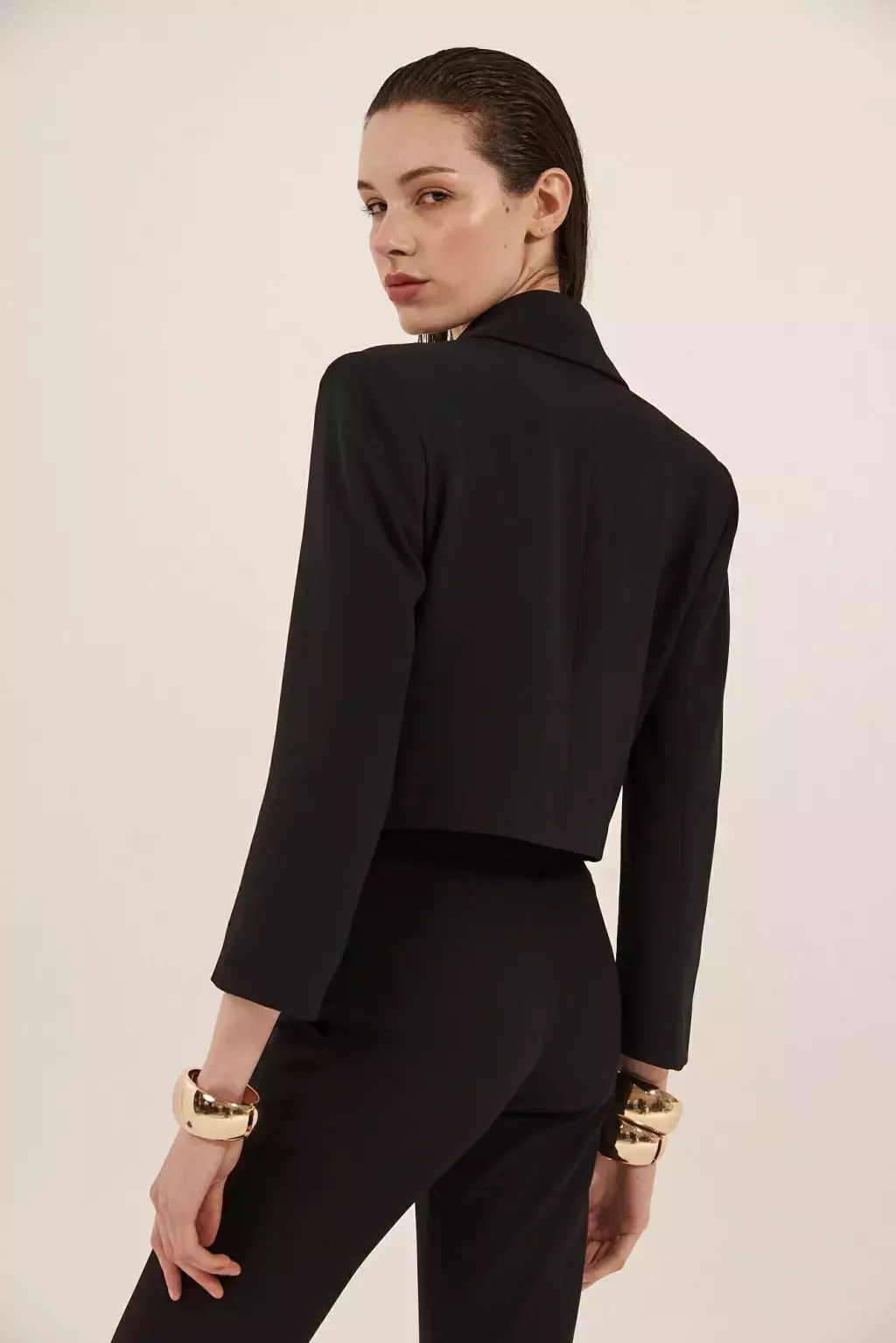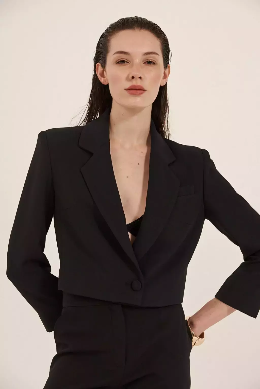 Blazer corto de silueta estructurada con solapas clásicas y cierre frontal de un botón forrado. Su diseño minimalista y elegante lo convierte en una pieza versátil, ideal para elevar cualquier look, de día o de noche. Disponible en negro y off White.