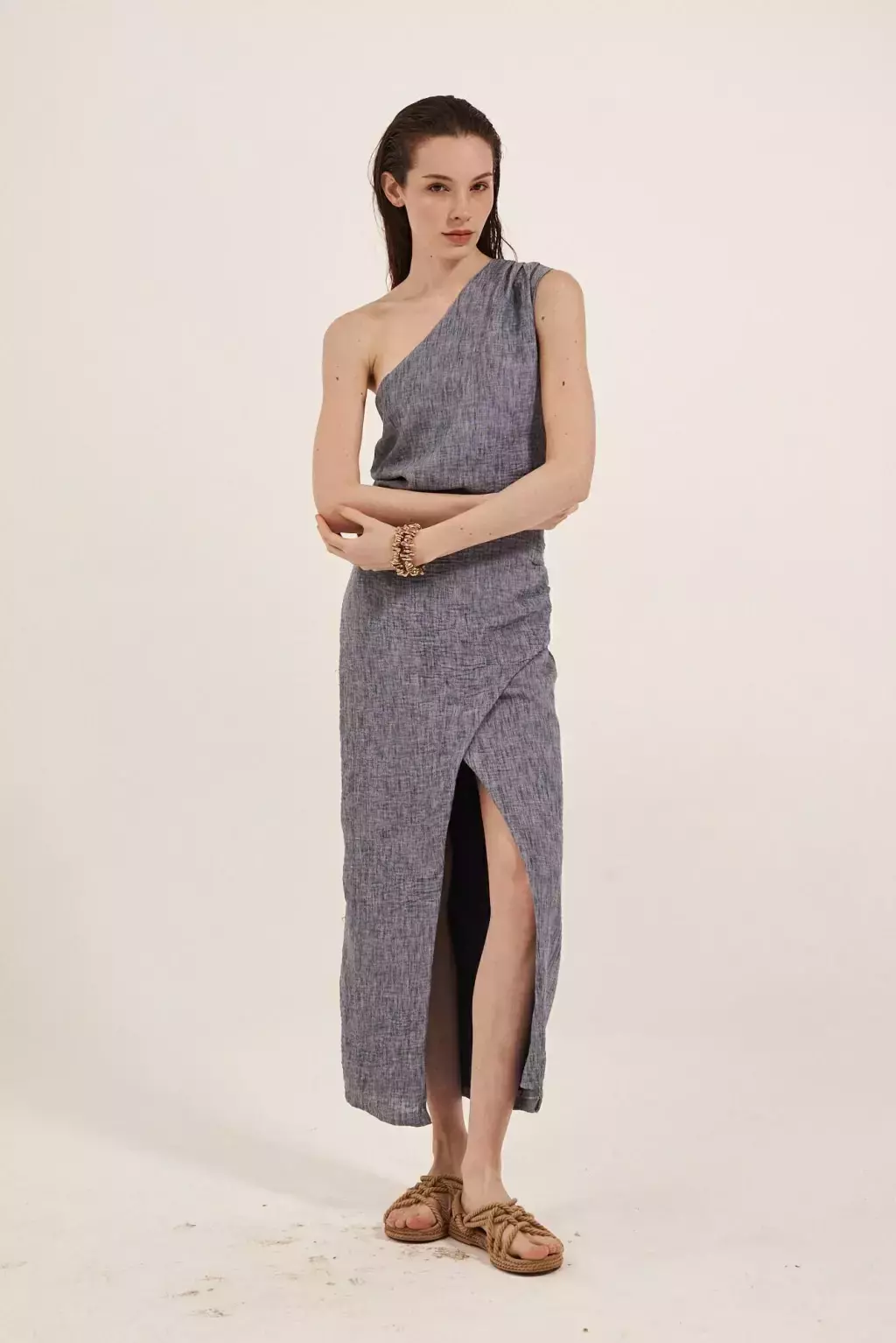 op de lino con diseño asimétrico de un solo hombro, ideal para un look fresco, moderno y sofisticado. Corte recto y relajado que aporta comodidad y libertad de movimiento. Silueta minimalista con caída natural de la tela. Perfecto para combinar con pantalones de lino, jeans o faldas, creando un estilo versátil tanto para el día como para la noche.