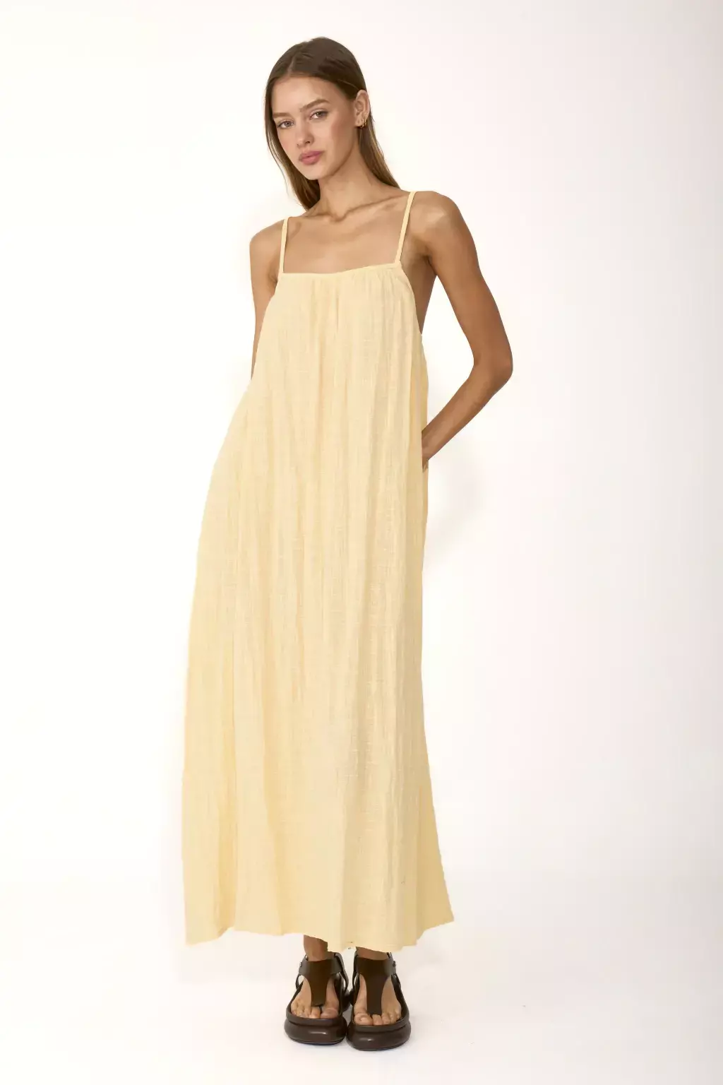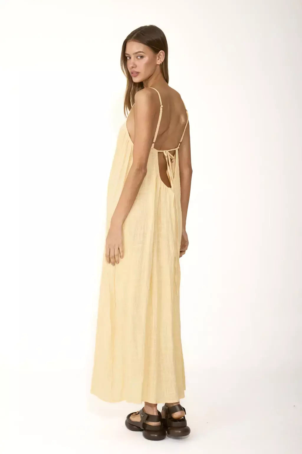 Fresco y cómodo. De lino, con frunce en escote y sisa, breteles regulables y espalda descubierta.