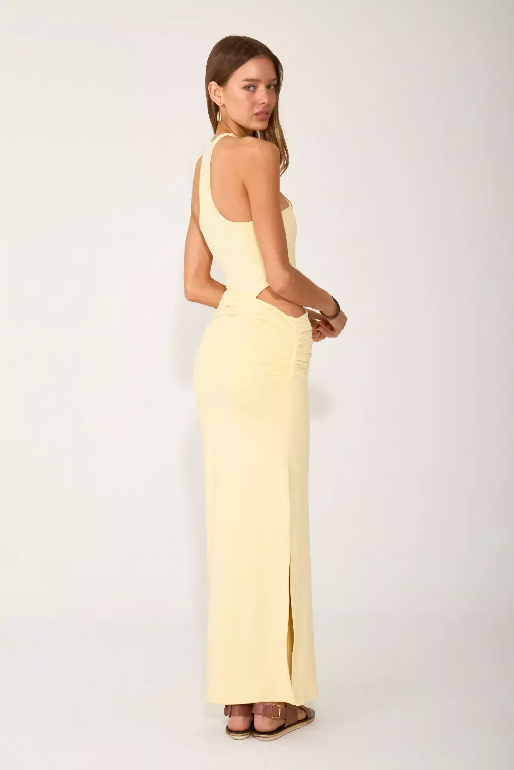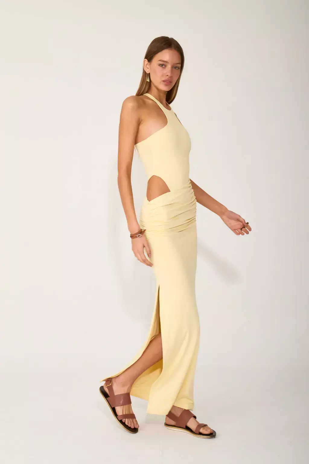 Con estilo y comodidad. De lycra, con body interno, falda irregular, tajo lateral y frunces sutiles.