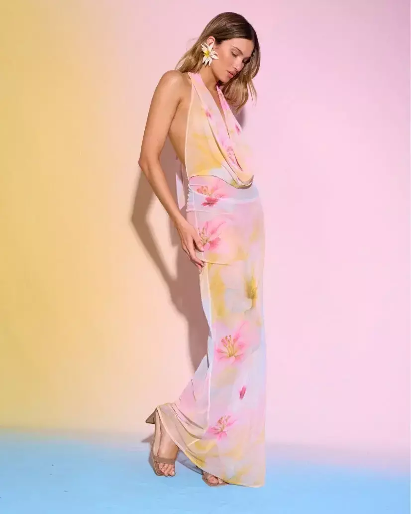 Vestido largo de microtull con estampa exclusiva de Shibinda con escote profundo con buche en delantero y tira para atar. Prenda con alto porcentaje de estiramiento. Es translúcido.