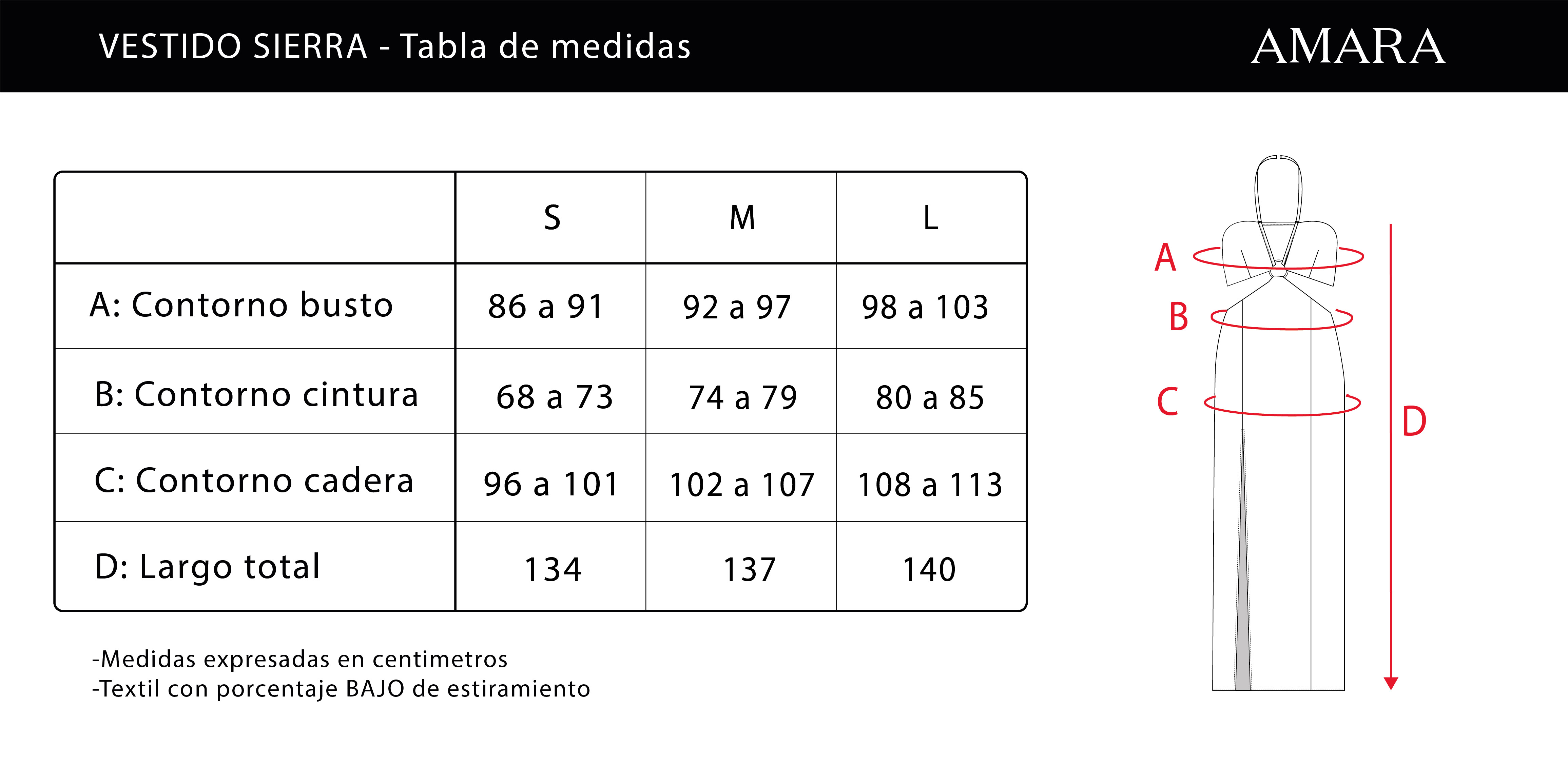 Vestido largo con bretel fino regulable en cuello. Lleva un top pinzado, con abertura en el pecho y elásticos en la espalda. Su falda es recta, con la cintura elastizada y lleva un tajo sobre la pierna. Ambas partes se unen en el abdomen mediante una argolla metálica. Está totalmente forrado.